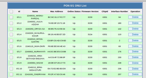 - Akan tampil list ONU pada PON tsb, lalu pilih ONU yg akan di hapus lalu klik Delete