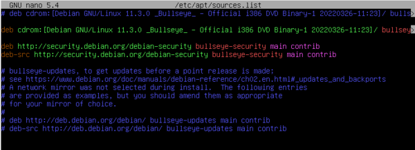 deb http://deb.debian.org/debian bullseye main contrib non-free deb-src http://deb.debian.org/debian bullseye main contrib non-free deb http://deb.debian.org/debian-security/ bullseye-security main contrib non-free deb-src http://deb.debian.org/sebian-security/ bullseye-security main contrib non-free deb http://deb.debian.org/debian bullseye-updates main contrib non-free deb-src http://deb.debian.org/debian bullseye-updates main contrib non-free